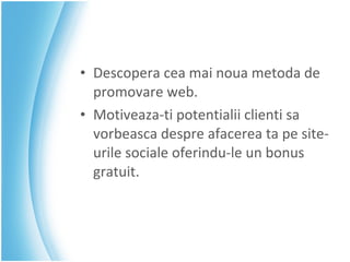 Documentul promovează o metodă inovatoare de promovare web prin intermediul site-ului http://www.trafic-net.net/. Oferă un bonus gratuit pentru a încuraja clienții să discute despre afacerea utilizatorului pe rețelele sociale. Este disponibil un test gratuit al software-ului timp de 7 zile.