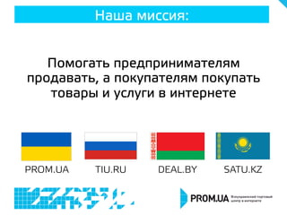Документ описывает платформу prom.ua, которая помогает предпринимателям эффективно продавать товары и услуги в интернете, предлагая доступ к 300 000 компаниям и 5 800 000 предложениям. Приведены плюсы и минусы различных способов онлайн-продаж, включая интернет-магазины, торговые площадки и объявления. Также рассматриваются возможности, такие как выбор дизайна, импорт товаров и интеграция с системами учета.