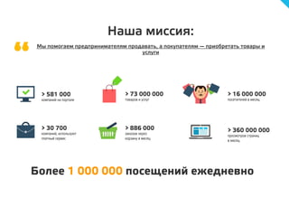 Документ описывает возможности платформы prom.ua, которая соединяет более 581 000 компаний с 16 000 000 посетителей в месяц, предлагая 73 000 000 товаров и услуг. Он также подчеркивает важность качества контента, обслуживания и SEO для повышения видимости товаров и компаний на портале. В заключение, представлена информация о персонализированной поддержке для пользователей, желающих успешно продавать онлайн.