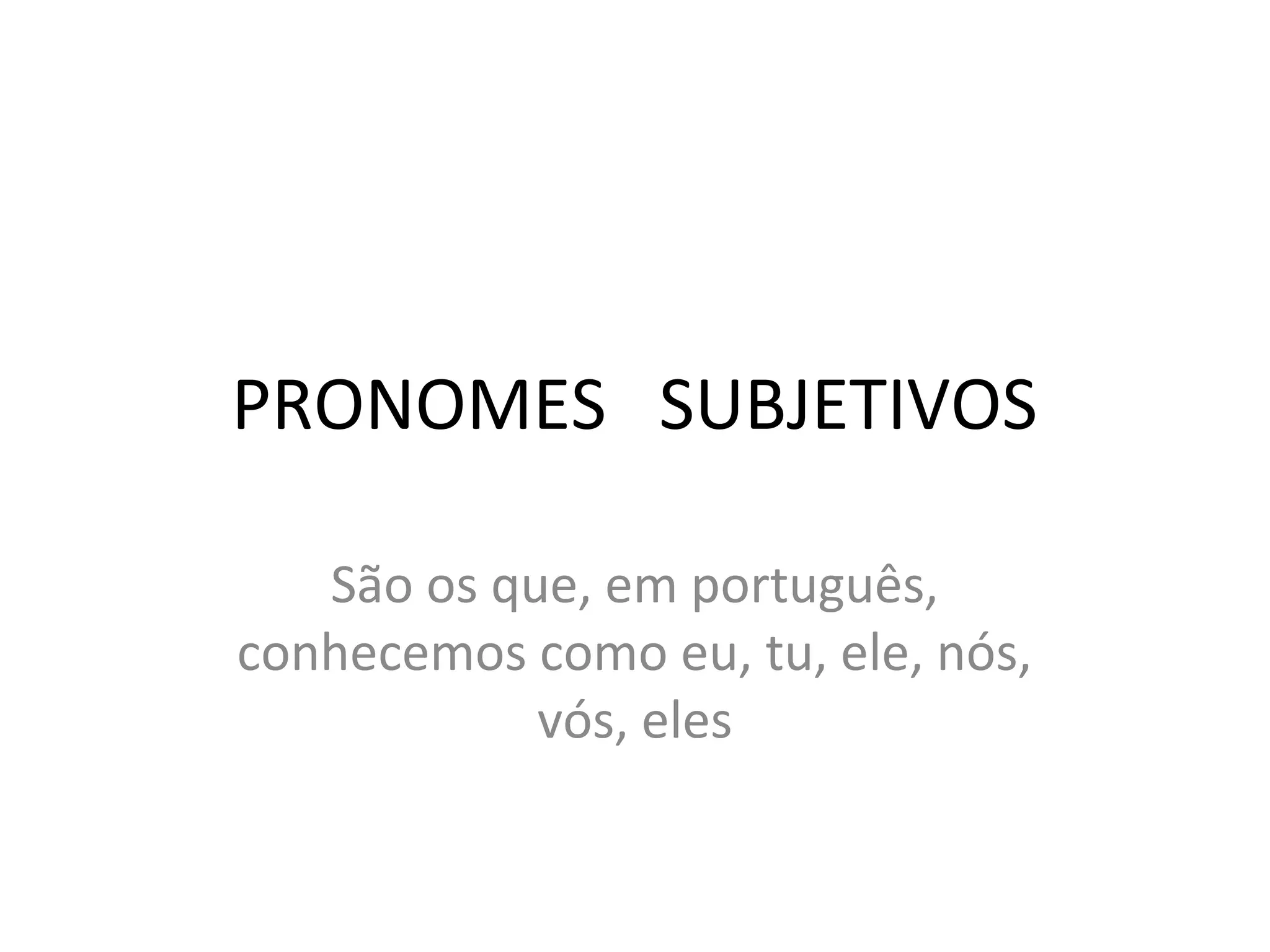 The document discusses Portuguese subjective pronouns such as eu, tu, ele, nós, vós, and eles. It provides examples of how to use each pronoun in Portuguese, including: - Eu is used as "I" and is always capitalized. - Você/Vocês is used as "you" whether singular or plural. - Ele is used to refer to a masculine person and Ela is used to refer to a feminine person. - It does not exist in Portuguese but is used to refer to objects, animals, nature phenomena, and has no direct translation. The document provides additional examples of how to use various subjective pronouns in Portuguese