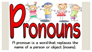 This document discusses different types of pronouns including personal pronouns, possessive pronouns, and reflexive pronouns. It provides examples and charts showing the different forms of each type of pronoun based on person (I, you, he, she, it, we, they) and number (singular or plural). For personal pronouns it distinguishes between subject and object forms. For possessive pronouns it shows the possessive forms. And for reflexive pronouns it indicates forms that reflect back on the subject. Worksheets with examples are also included to help identify the different pronoun types.