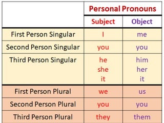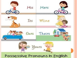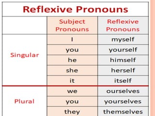 The document discusses different types of pronouns, including personal pronouns, possessive pronouns, and reflexive pronouns. Personal pronouns replace nouns and can be first person (I, we), second person (you), or third person (he, she, they, it). Possessive pronouns show possession, like mine, yours, his, hers, ours, theirs. Reflexive pronouns reflect an action back on the subject, formed by adding self or selves to personal pronouns like myself, yourself, himself, ourselves.