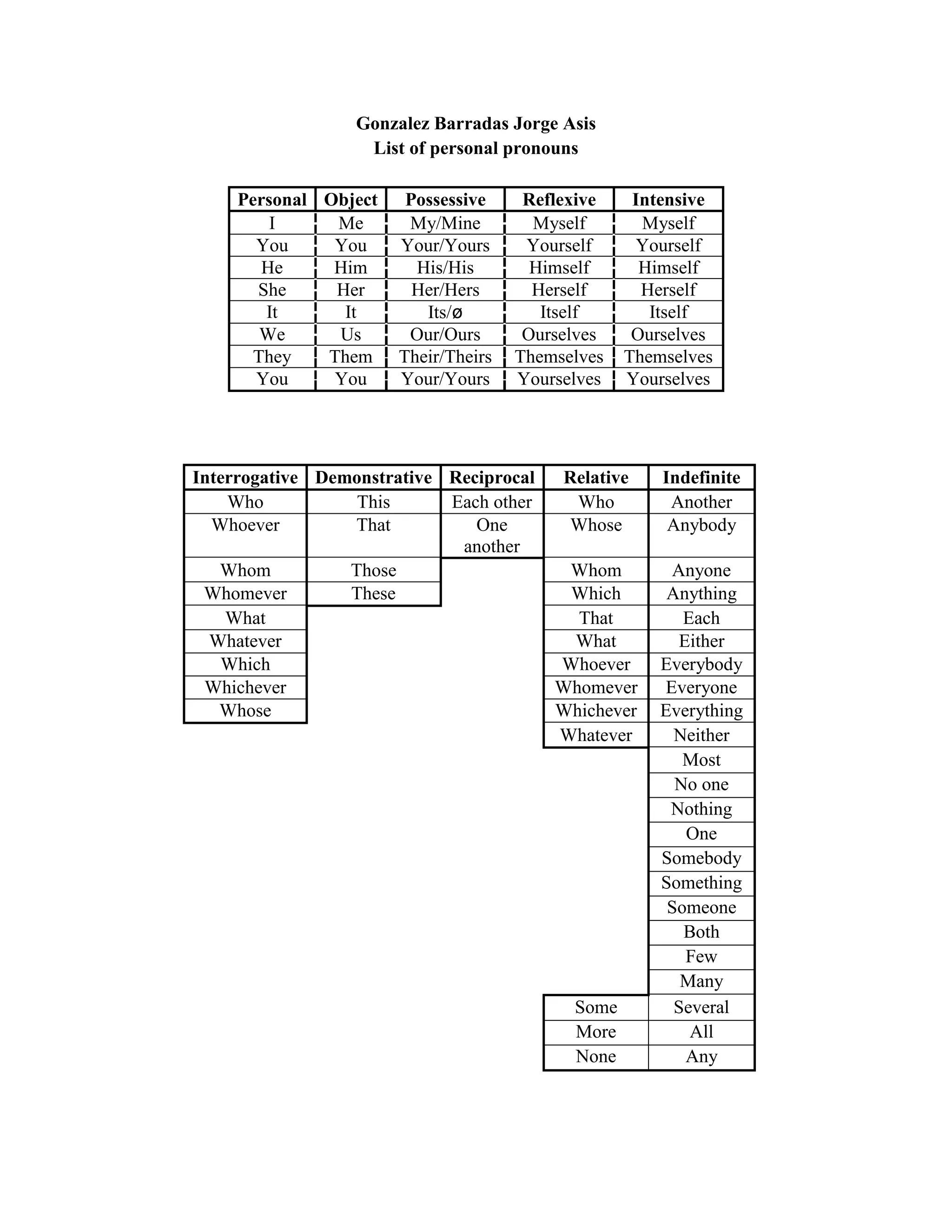 This document provides a list of personal pronouns in English organized by type, including subject, object, possessive, reflexive, intensive, interrogative, demonstrative, reciprocal, relative, and indefinite pronouns. It displays each pronoun and its variations across the different categories in a table for easy reference.
