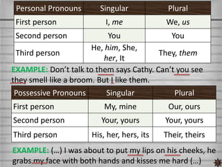 This document defines and provides examples of different types of pronouns: personal pronouns, possessive pronouns, reflexive and intensive pronouns, demonstrative pronouns, indefinite pronouns, interrogative pronouns, and relative pronouns. It also provides practice identifying different pronouns in examples sentences.