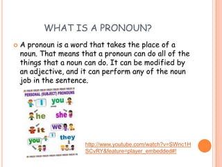 This document defines and describes different types of pronouns. It explains that a pronoun takes the place of a noun and can do anything a noun can do in a sentence. The types of pronouns discussed are possessive, personal, reflexive, and interrogative pronouns. Personal pronouns refer to specific persons, places or things and change form based on person, number or gender. Reflexive pronouns end in "-self" or "-selves" and are used when the subject and object are the same.