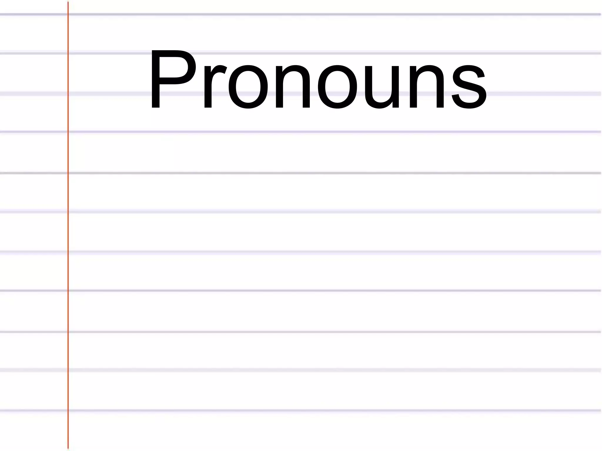 This document defines and provides examples of different types of pronouns, including personal pronouns like I, you, he, she; possessive pronouns like mine and yours; demonstrative pronouns like this and that; relative pronouns like who and which; reflexive pronouns like myself and yourself; interrogative pronouns like who and what; and indefinite pronouns like all and either.