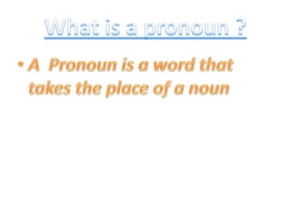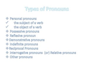 This document defines and provides examples of different types of pronouns in English, including personal pronouns, possessive pronouns, reflexive pronouns, demonstrative pronouns, indefinite pronouns, interrogative pronouns, and reciprocal pronouns. Personal pronouns can be subjects or objects of verbs. Possessive pronouns indicate ownership or possession. Reflexive pronouns refer back to another noun or pronoun. Demonstrative pronouns point out or identify nouns. Indefinite pronouns refer to unspecified quantities. Interrogative pronouns are used to ask questions. Reciprocal pronouns express a relationship between individuals.