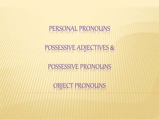 This document discusses different types of pronouns including personal pronouns, possessive adjectives, and possessive pronouns. It provides examples of each type of pronoun such as I, me, my, mine for personal pronouns and his, hers, theirs, ours for possessive pronouns. The document aims to explain how these pronouns are used to refer to people and objects in possessive terms.