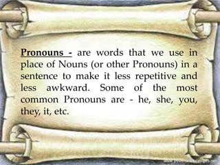 Pronouns are used in place of nouns to avoid repetition. There are several types of pronouns including personal pronouns that change form based on gender, number, and case; demonstrative pronouns like this and that; interrogative pronouns like who and what that are used to ask questions; relative pronouns like who and which that join two clauses; and indefinite pronouns like anyone and everything that refer to unspecified people or objects. Pronouns can also be reflexive to refer back to a noun in the same sentence or reciprocal to show two nouns acting in the same way toward each other.