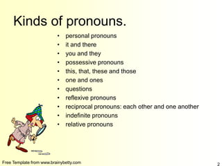 The document discusses different types of pronouns in English including personal pronouns, possessive pronouns, demonstrative pronouns, indefinite pronouns, and reflexive pronouns. It provides examples of how and when to use different pronouns such as subject and object personal pronouns, possessive pronouns like 'mine' and 'yours', and demonstrative pronouns like 'this' and 'that'. The document also covers reciprocal pronouns like 'each other' and indefinite pronouns including 'somebody' and 'nothing'.