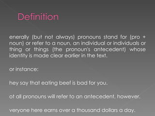 The document discusses different types of pronouns in English, including: