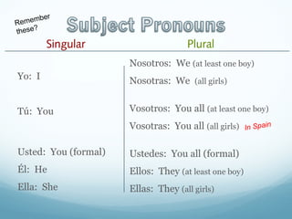 This document provides information on using the verb "ser" in Spanish. It begins by introducing subject pronouns and the conjugations of "ser". It then provides examples of how to form sentences using "ser" by matching the subject pronoun to the correct conjugated form. The document explains that "ser" is used to describe characteristics, possessions, times, dates, identities, nationalities and professions. It provides practice sentences for students to fill in the correct form of "ser". Finally, it notes that to make a sentence negative, "no" is placed before the conjugated form of "ser".
