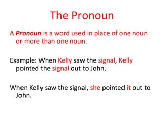 This document discusses the different types of pronouns in English. It defines pronouns as words used in place of nouns and provides examples. The main types of pronouns discussed include personal pronouns, reflexive and intensive pronouns, demonstrative pronouns, interrogative pronouns, relative pronouns, and indefinite pronouns. For each type, examples are given to illustrate their meanings and uses.