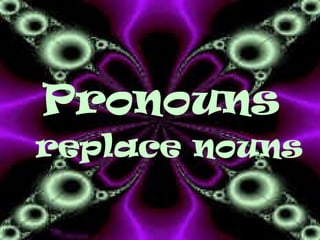 This document provides an overview of different types of pronouns in English, including personal pronouns, reflexive/intensive pronouns, demonstrative pronouns, interrogative pronouns, indefinite pronouns, and relative pronouns. It defines each type of pronoun and provides examples. The document explains that pronouns replace nouns and come in various forms depending on their function in a sentence.