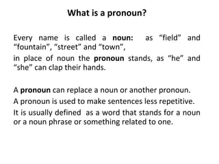 A pronoun is a word that replaces a noun or another pronoun. There are different types of pronouns including personal pronouns, demonstrative pronouns, interrogative pronouns, relative pronouns, indefinite pronouns, and reflexive pronouns. Pronouns must agree with their antecedent in number, gender, and case.