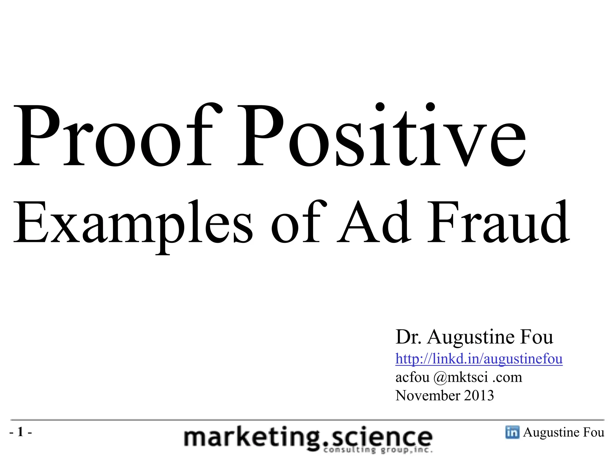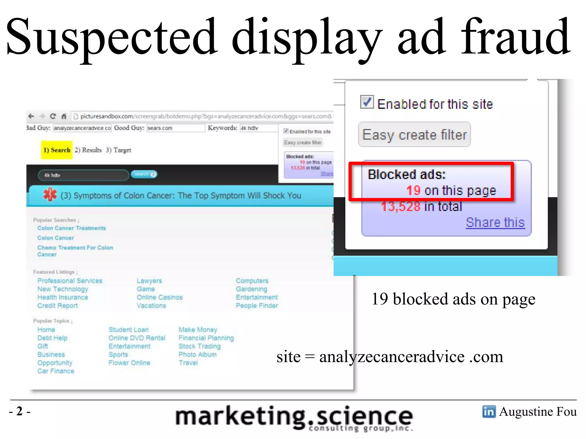 Dr. Augustine Fou presents evidence of ad fraud, including blocked ads and fraudulent clicks on various websites. Highlights include examples from well-known retailers like Sears and Clorox, as well as the presence of numerous identical fraudulent sites. Fou emphasizes the importance of optimizing advertising and detecting fraud within digital marketing channels.