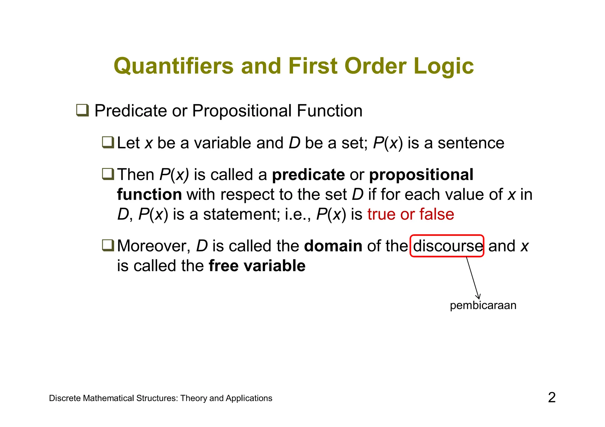 The document discusses quantifiers and proof techniques in discrete mathematics, focusing on predicate logic, including universal and existential quantifiers, negation of predicates, and various proof methods like direct proof, proof by contradiction, and mathematical induction. It provides definitions, examples, and additional rules of inference relevant to mathematical reasoning. The concepts covered are foundational for understanding logical arguments and mathematical proofs.