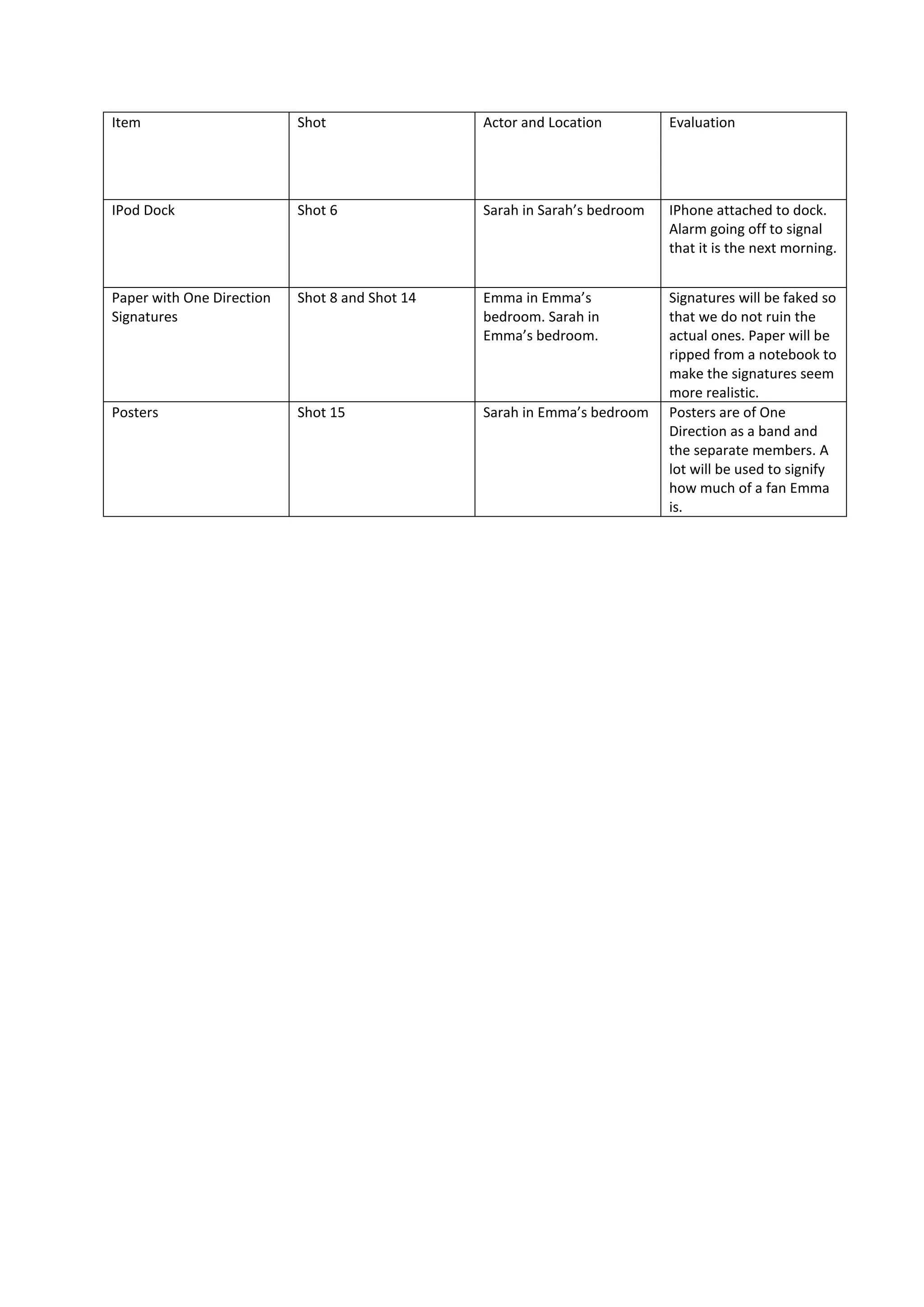The document outlines 3 items - an iPod dock, paper with One Direction signatures, and posters - that will be used in different shots of a film being shot in two characters' bedrooms. For shot 6, an iphone will be attached to a dock with an alarm going off to indicate the next morning. In shots 8 and 14, fake signatures will be made on paper ripped from a notebook to seem realistic without ruining actual signatures. Shot 15 shows posters of the band and its members to show a character's fandom.