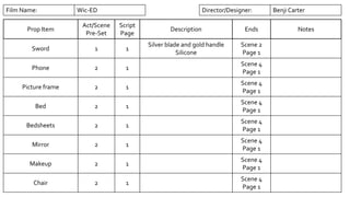 This document is a prop list for the film "Wic-ED" containing items needed for various scenes and acts, including a sword, phone, picture frame, bed, bedsheets, mirror, makeup, chair, book, paper, candles, spell book, sage, and notebook along with the scene and page numbers where each prop is used. The prop list also notes quantities needed and any additional information. It is directed and designed by Benji Carter.