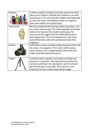 Hannah Hughes is creating a rock magazine for a school project. She lists props and reasons for including them to make the magazine look professional. She plans to feature models holding a guitar to define them as artists, wearing dark clothing and jeans stereotypical of rock, and done up with hair and makeup to look like real rock stars. Accessories will add character. A camera and tripod will be used to take high quality photos fitting for the magazine.