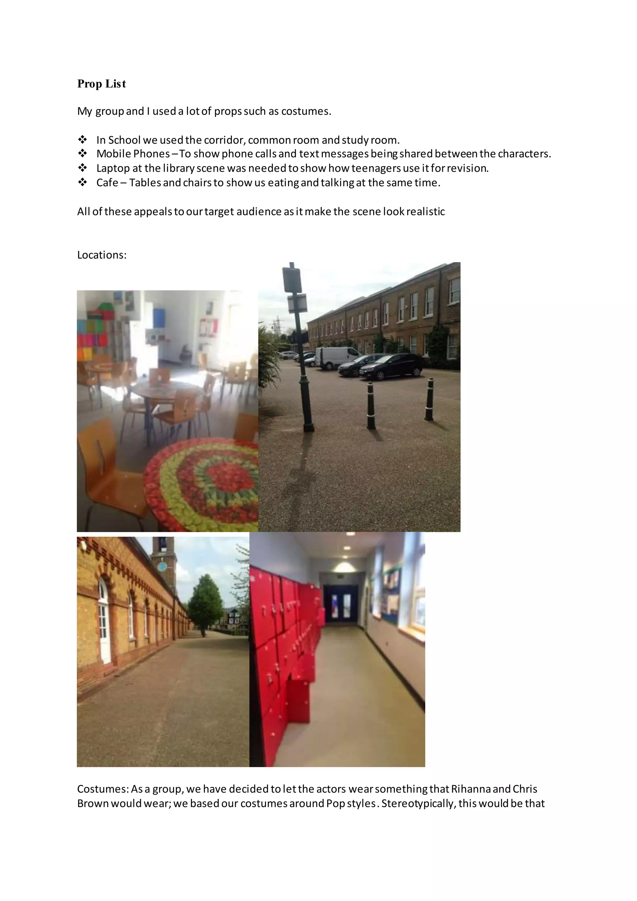 My group used props like costumes, mobile phones, laptops, and cafe furniture to make the scenes in their school production more realistic for their target audience. They dressed the actors in styles typical of pop artists Rihanna and Chris Brown to portray the characters, with the male protagonist in jeans, checked shirts, jackets and black accessories to capture the R&B style.