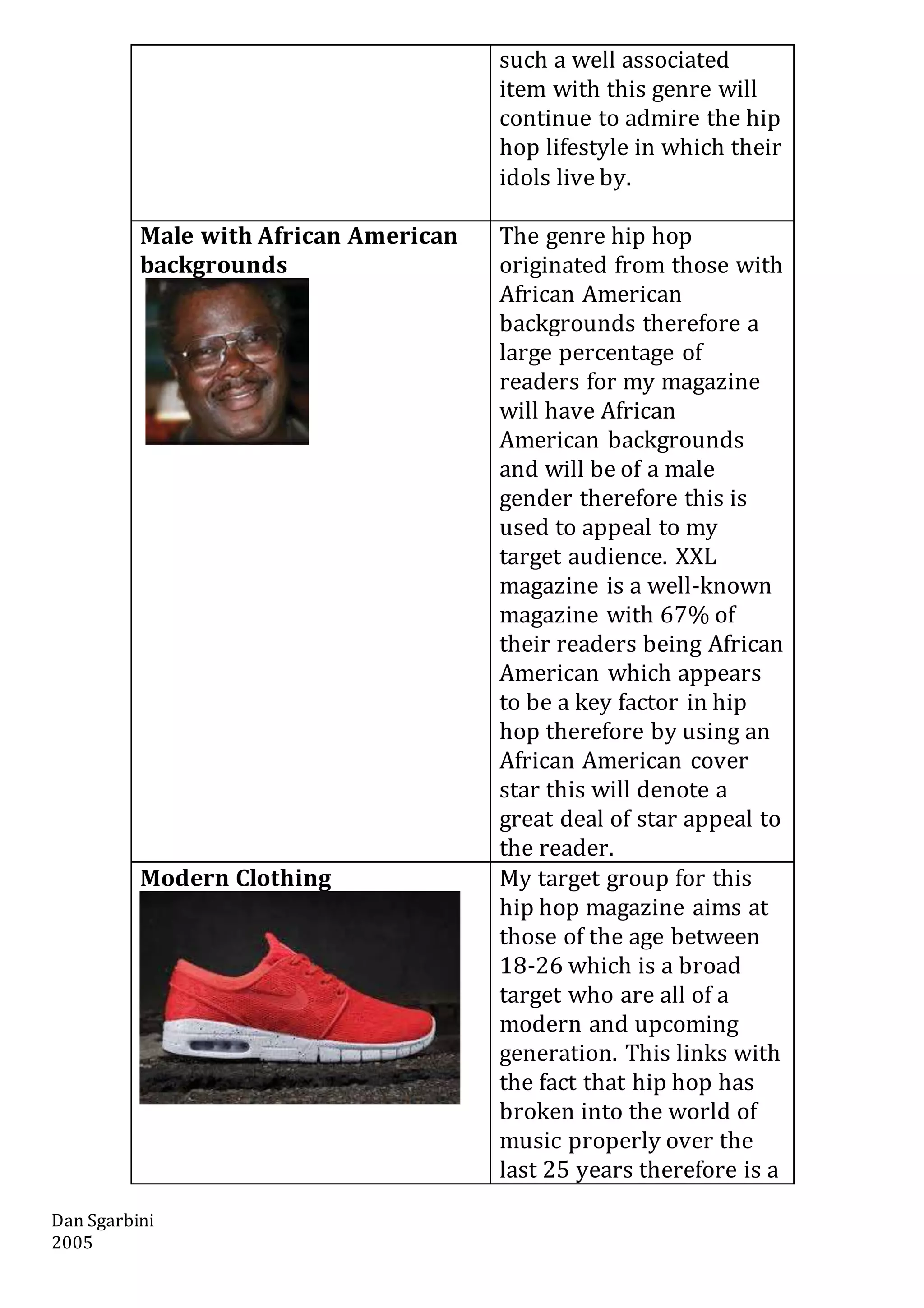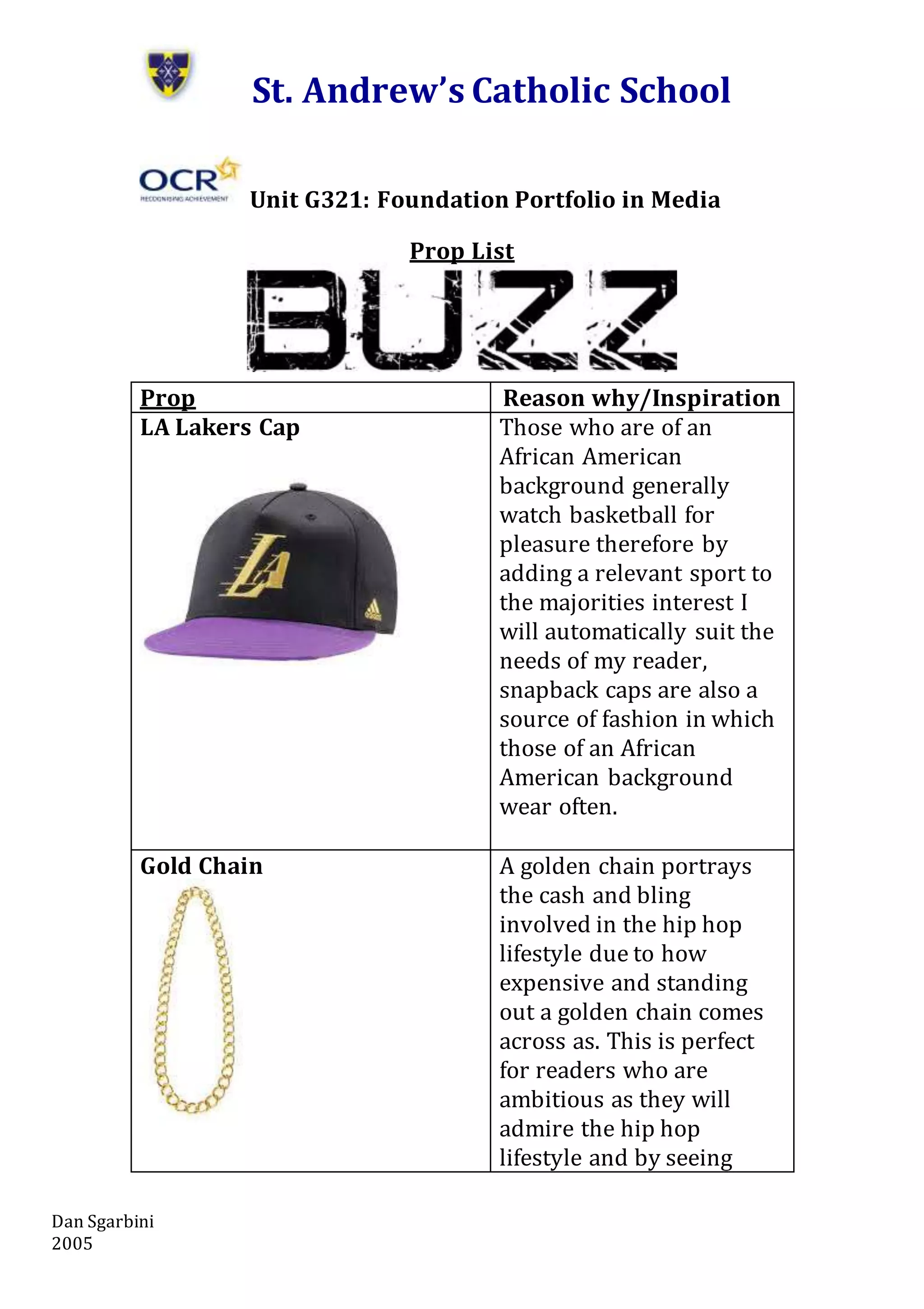 Dan Sgarbini created a prop list for a hip hop magazine with reasons for each prop's inclusion. The props were a LA Lakers cap to appeal to African American basketball fans, a gold chain to portray the flashy hip hop lifestyle, a photo of a male African American as hip hop's origins and most fans are African American males, modern clothing to appeal to the magazine's 18-26 year old target age range as hip hop is a modern genre, Ray Bans and Beats headphones as they are popular hip hop accessories, and the use of vocabulary, colors, and conventions relevant to hip hop to keep the magazine closely tied to the genre.