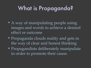 The document examines propaganda techniques and provides examples from World War II. It defines propaganda as manipulating people using images and words to promote a desired outcome rather than educate. Several propaganda techniques are described, including association/transfer, bandwagon, appealing to emotions like fear or pity, repetition of simple slogans, and misleading use of language. Quotes from Hitler and other propagandists emphasize appealing to masses through limited, repeated messages to shape their thinking.