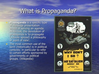 Propaganda was widely used during World War 1 by all participating nations. Governments created propaganda posters to justify their country's involvement in the war, recruit soldiers, raise money and resources for the military effort, and encourage conservation. Posters were an effective propaganda tool as television and widespread radio access did not yet exist. Governments often focused propaganda posters on raising money from citizens to fund the costly war. Common propaganda techniques used in posters included name-calling, one-sided presentation of facts, bandwagon appeals, testimonials, portraying the cause as for common people, transferring respect from one symbol to another, and using vague positive language.