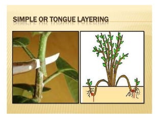 1. The document discusses various methods of plant propagation including sexual propagation through seeds and asexual propagation through vegetative methods like stem cuttings, layering, grafting, and budding.
