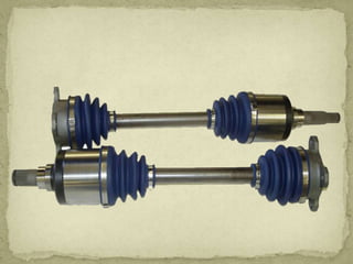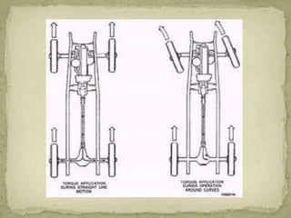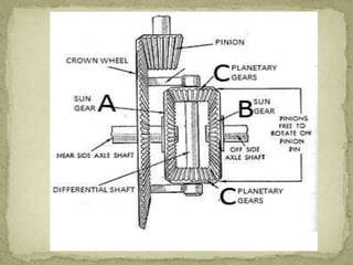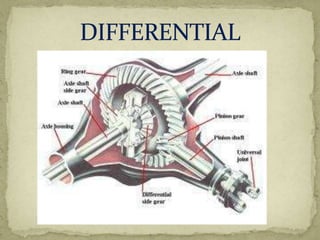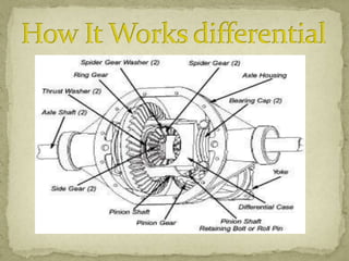 2) The differential receives engine power from the propeller shaft and transfers it to the rear wheels, allowing them to rotate at different speeds during turns. It uses bevel and planetary gears to distribute torque.