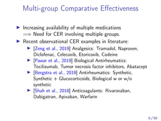 The document discusses the use of propensity score methods in comparative effectiveness research (CER) involving multiple treatment groups, highlighting adjustments for various types of treatments. It covers the challenges and methodologies for designing multi-group CER, including examples and simulations demonstrating the efficiency of methods like matching weights (MW) and their advantages over traditional pairwise matching and inverse probability of treatment weighting (IPTW). Empirical findings from datasets are also presented to support the effectiveness of different propensity score techniques in balancing covariates across treatment groups.