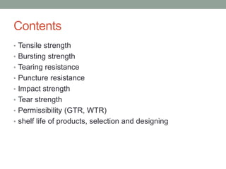 This document discusses various properties of packaging materials including tensile strength, bursting strength, tearing resistance, puncture resistance, impact strength, and permeability. It defines each property and describes the machines and calculations used to measure them. Properties like tensile strength, bursting strength, and tearing resistance indicate a material's resistance to pulls, bursts, and tears. Permeability properties like oxygen transmission rate and water vapor transmission rate are important for determining shelf life of packaged foods. Understanding these material properties helps in selecting appropriate packaging.