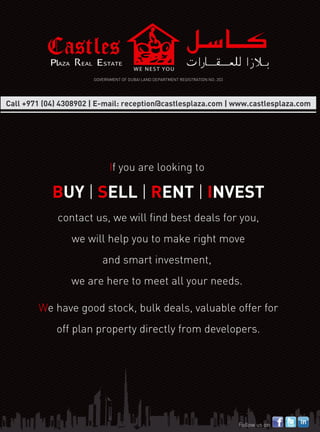 The document discusses various topics related to the Dubai real estate market, highlighting the impact of Cityscape Global 2014 on demand and future developments. It emphasizes real estate franchising opportunities, provides insights on rental yields in villa communities, and features interviews with industry professionals. Additionally, it includes exclusive property listings and expert advice to guide potential investors in the current market landscape.