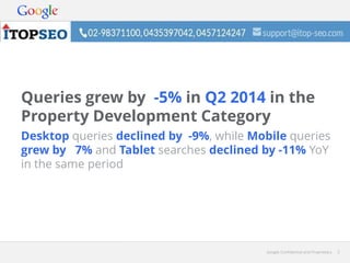 This document provides a quarterly update on search metrics for the property development category on Google search. It finds that overall queries declined by -5% in Q2 2014 compared to the same period last year. Mobile search grew by 7% while desktop declined by -9% and tablet by -11%. The average cost per click (CPC) for property development searches increased by 3.61% to $0.85. 39% of all property development searches now occur on mobile devices.