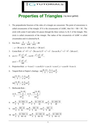 The document discusses various properties and formulas related to triangles. It covers topics like the circumcenter, sine rule, cosine rule, projection rule, tangent rule, area formulas, relationships between angles and sides, and properties related to isosceles, right, and equilateral triangles. In total it presents over 20 different properties and formulas for working with triangles.