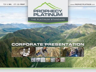 The document is a forward looking statement and presentation by Prophecy Platinum Corp regarding their platinum mining projects. It discloses that the information provided is subject to risks and uncertainties and not a commitment to any transaction. It also provides details about two of their key projects - the Wellgreen platinum project in Yukon Territory, Canada and the Shakespeare platinum project in Sudbury Mining District, Ontario. Technical information on the projects is based on various technical reports filed with SEDAR.