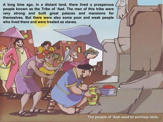 Hud was a prophet sent to the tribe of 'Aad, who lived prosperous lives but worshipped idols. Hud preached to them about worshipping the one true God, but the leaders refused to listen and grew angry with Hud, beating him. Despite warnings of punishment from Hud, the people continued idol worship. A famine struck for 7 years, but still they mocked Hud. Dark clouds gathered and a strong cyclone destroyed the disbelievers over 7 days, while Hud and his followers were saved after taking refuge outside the city.