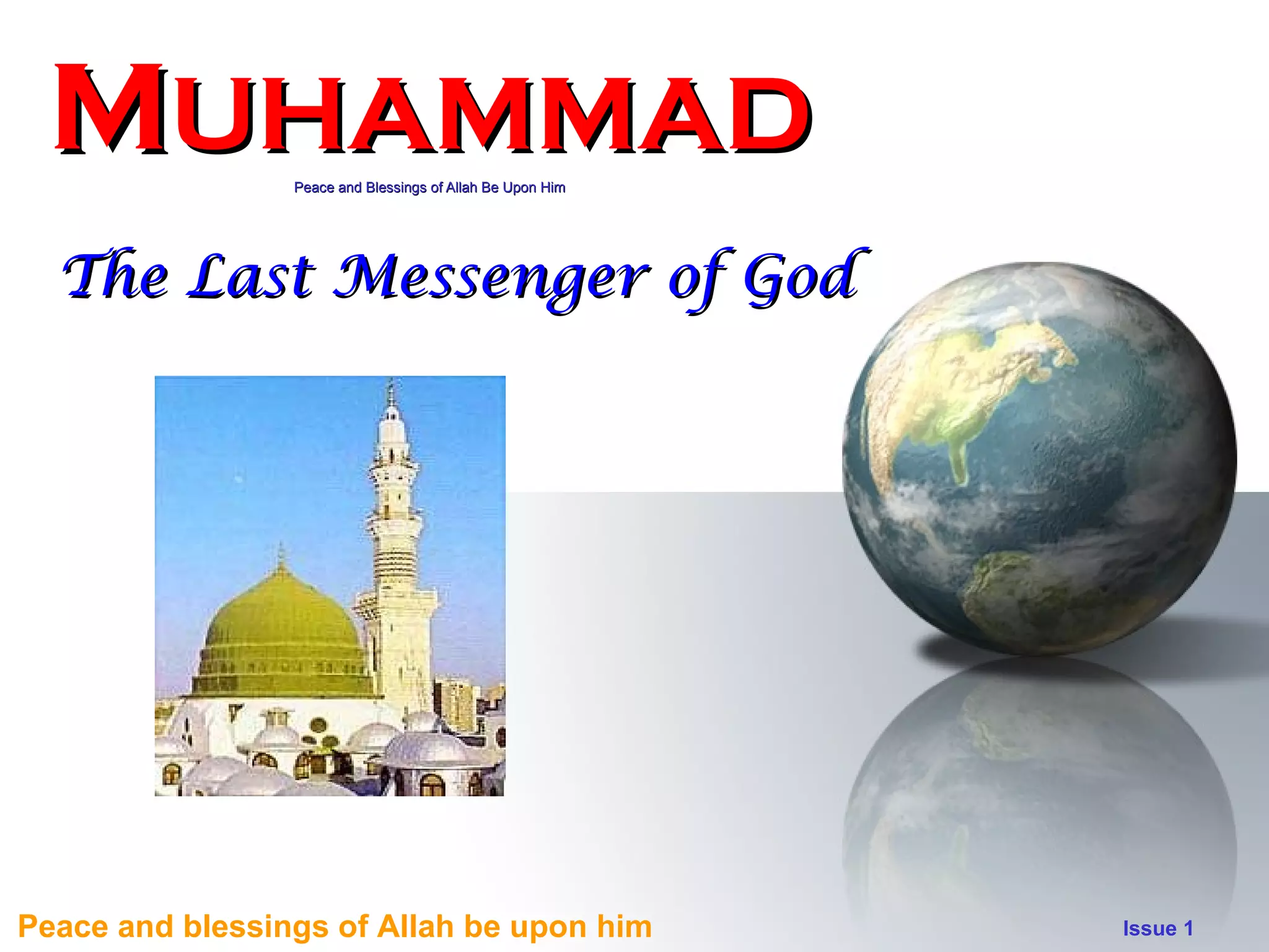 The document provides an overview of the life and teachings of the Prophet Muhammad. It describes how he established a just society and introduced reforms that improved women's rights and social conditions. It highlights his virtues of humility, generosity and bringing peace. His teachings addressed all aspects of life and established lasting guidance for mankind based on divine revelation.