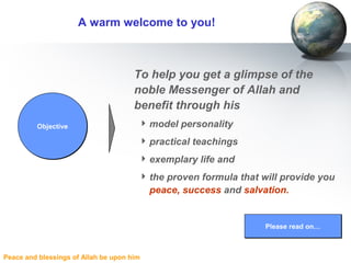 The document provides information about the life and teachings of the Prophet Muhammad. It describes how he brought people out of ignorance and restored true worship of God alone. It highlights Muhammad's noble character, humility, generosity and role in establishing a just, peaceful and prosperous society. The document also discusses Muhammad's teachings on various aspects of life and society, including women's rights and equality. It explains how following his guidance can help solve today's problems and benefit people in this life and the hereafter.
