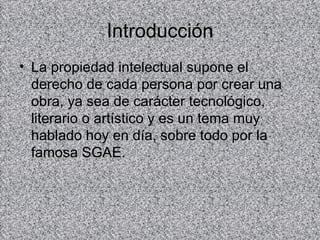Este documento trata sobre la propiedad intelectual y el uso justo de obras creativas. Explica que la propiedad intelectual protege el derecho de una persona a crear obras literarias, artísticas o tecnológicas. También describe el concepto de "uso justo", el cual permite el uso limitado de material sin permiso siempre que sea con fines educativos o de información. Además, introduce a Creative Commons, una organización que busca reducir barreras legales a la creatividad a través de licencias que permiten compartir y crear obras