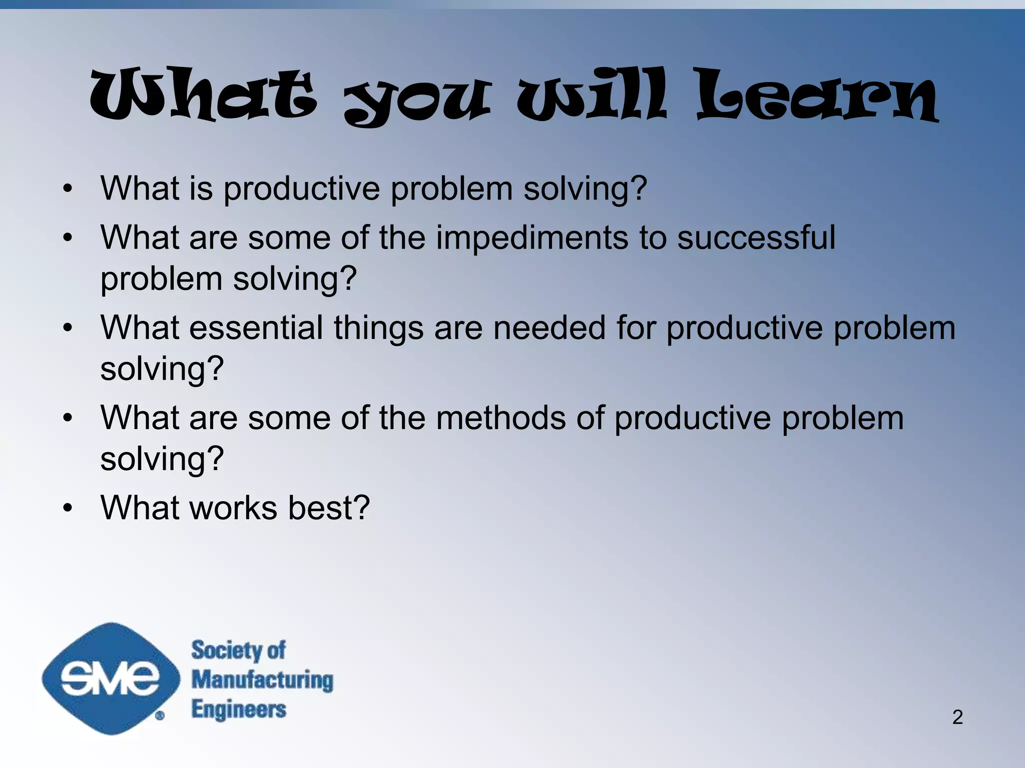 This document provides information on productive problem solving. It discusses what productive problem solving is, common impediments, and essential elements. It also outlines several problem solving methodologies and techniques, including the scientific method, brainstorming, FAST diagramming, and evaluating potential solutions. The goal is to provide a structured approach to defining problems, identifying root causes, generating alternatives, and selecting the best solution.