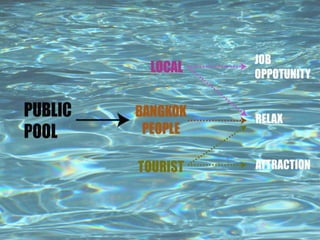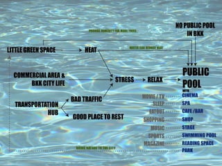 The document discusses a survey of 50 people in Bangkok that found 80% said they felt stress. The most popular activities for relieving stress were watching movies or TV (62.5%), listening to music (12.5%), eating out (10%), and sleeping (5%). It also provides case studies of two spa facilities - Paracelsus Spa and Pools in Salzburg, Austria, which has 7 pools and covers 14,000 square meters, and Thermal Vals in Switzerland, designed by Peter Zumthor, which covers 60,000 square meters and provides a sensory bathing experience through its use of light, water and stone.
