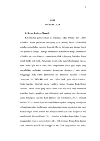 Dokumen ini adalah proposal skripsi yang menganalisis faktor-faktor yang mempengaruhi loan to deposit ratio (LDR) pada bank campuran di Indonesia antara 2010 hingga 2015. Penelitian ini menyoroti risiko likuiditas yang dihadapi oleh bank dan pentingnya menjaga LDR dalam kisaran yang sehat untuk mencegah potensi kebangkrutan. Fokus penelitian mencakup pengaruh lending rate, cost of funds, dan berbagai rasio keuangan lainnya terhadap LDR.