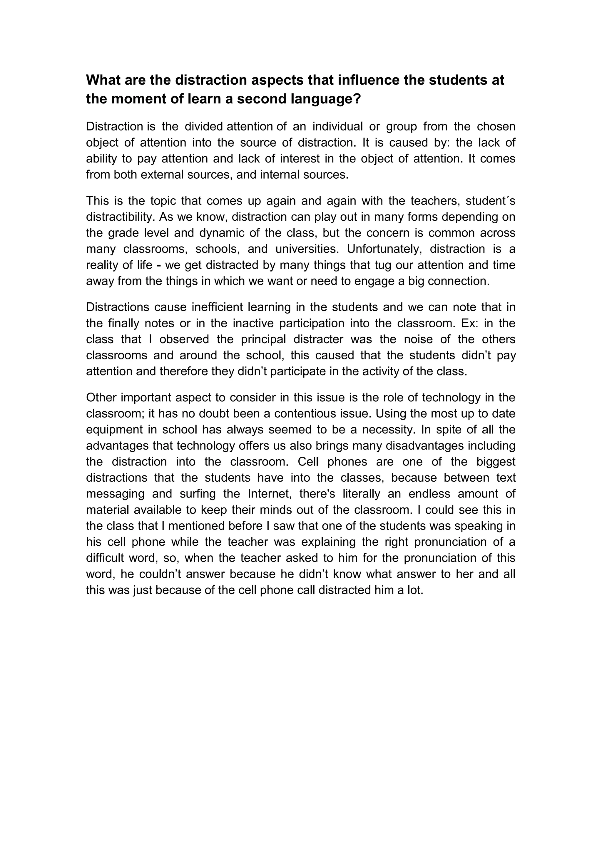 Distraction is caused by a lack of ability to focus attention and lack of interest in the topic. It stems from both external sources like noise from other classrooms, as well as internal sources like cell phone use. Distraction leads to inefficient learning as students do not pay attention and do not actively participate. For example, in one observed class, noise from other areas of the school distracted students and prevented their participation. Technology like cell phones is a major distraction as students will text and surf the internet instead of focusing in class, like one student who was on his phone during a pronunciation lesson and could not answer the teacher as a result.