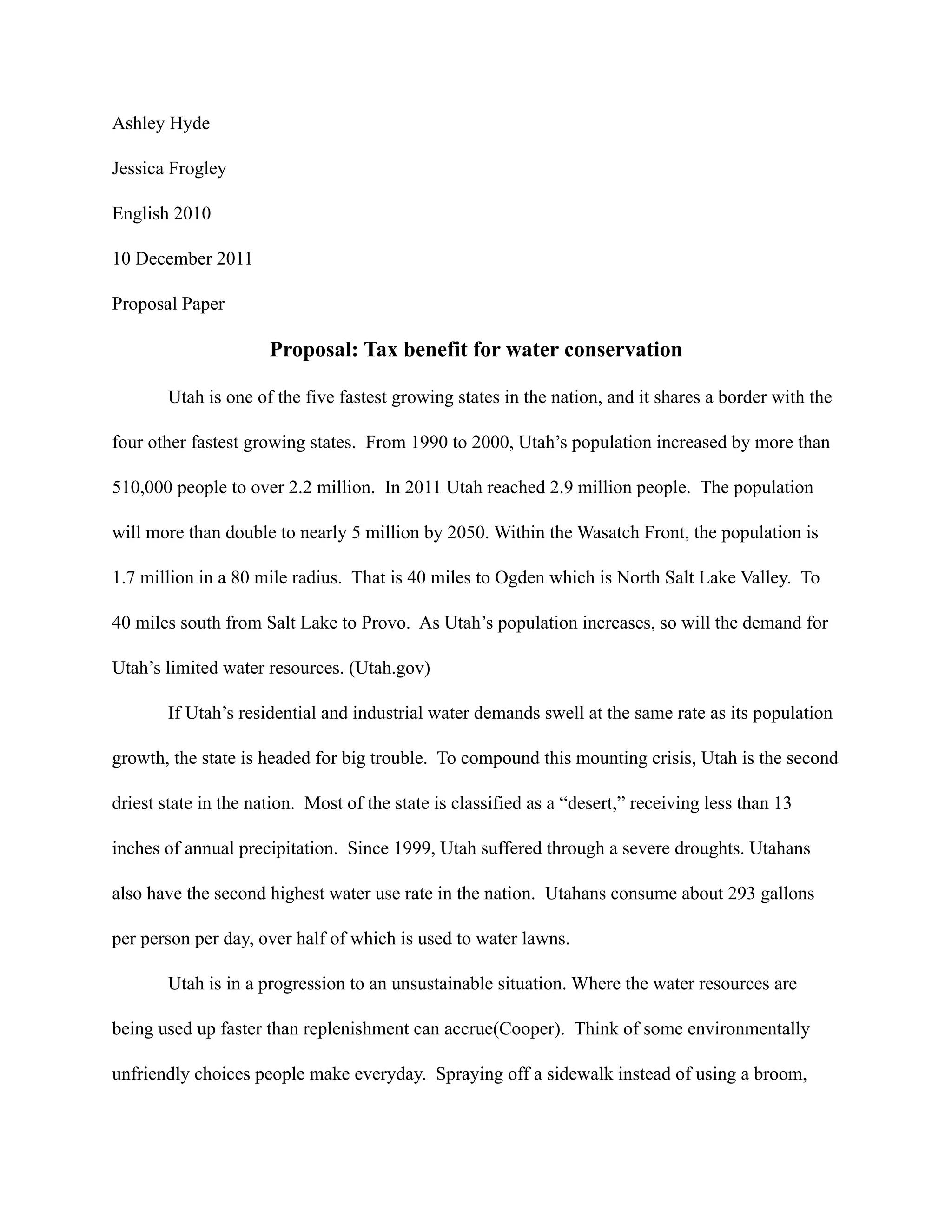 This proposal suggests a tax credit for Utah residents who convert their water-intensive lawns into water-wise landscapes. Utah faces increasing water demands from its growing population, but receives little annual precipitation. Most residents use over half their water outside on lawns. The tax credit would cover costs of installing water collection, graywater, or other conservation systems. This would incentivize individuals to reduce water use, helping ensure sufficient long-term water supply as the population doubles by 2050. Estimates show residents could save over 29,000 gallons and $350 annually through such conversions.