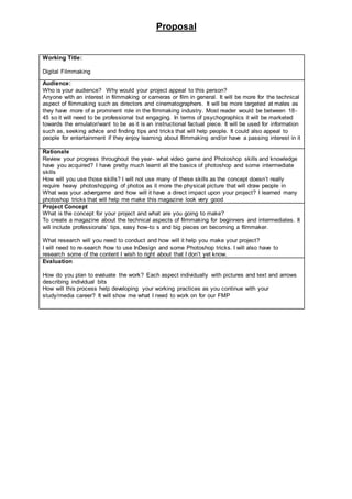 The document proposes a digital filmmaking magazine targeted at males aged 18-45 with an interest in filmmaking. The magazine will provide tips, how-tos, and profiles on becoming a filmmaker to appeal to those seeking advice or with a passing interest. While the creator's video game and Photoshop skills from previous work will not be heavily used, researching InDesign and Photoshop techniques along with filmmaking content will help develop the proposed magazine. Each aspect of the magazine will be individually evaluated with descriptions to identify areas for further development and improve the creator's working practices.