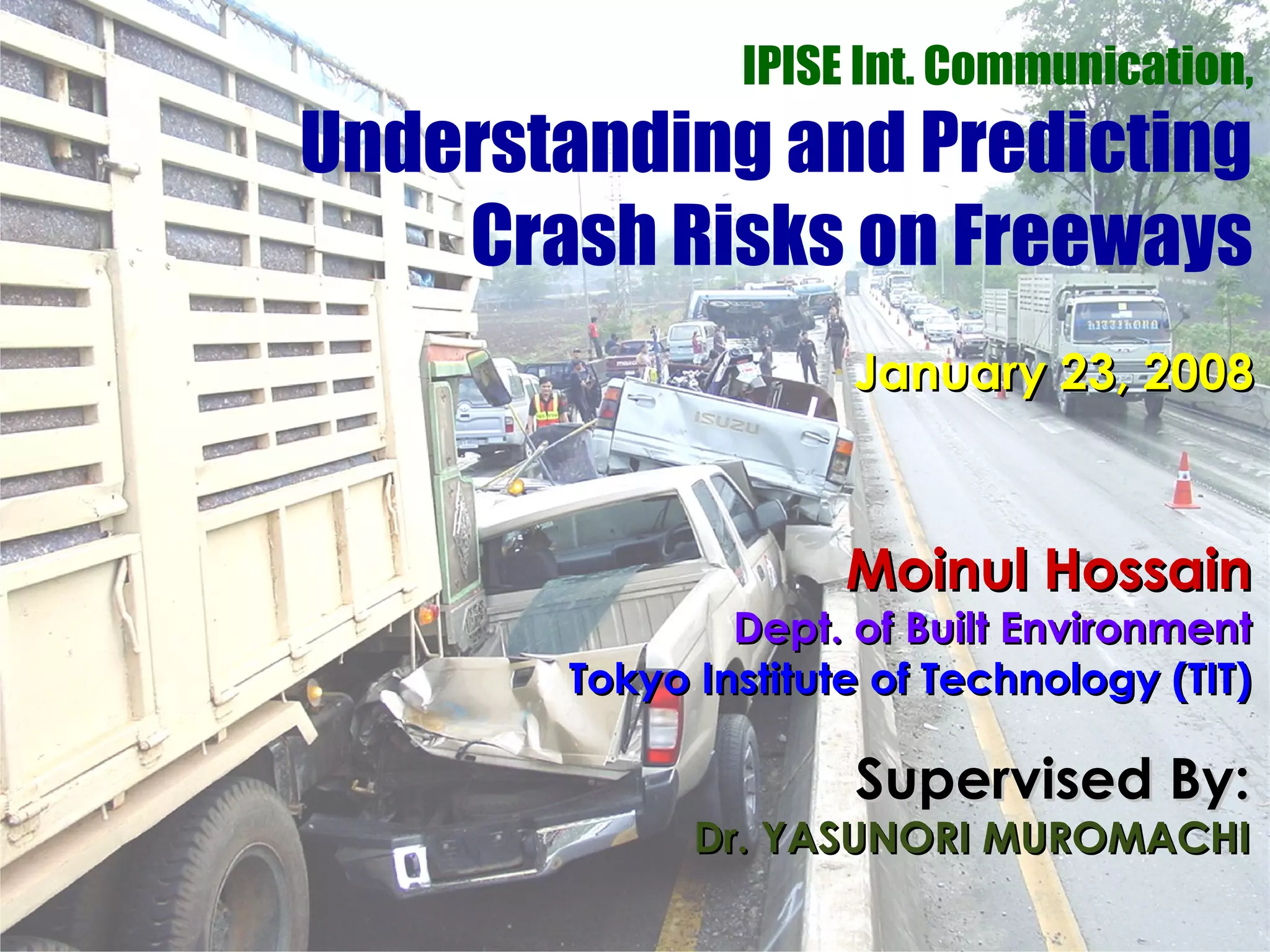 This document outlines Moinul Hossain's research on predicting crash risks on freeways. It discusses the problem of road accidents globally and in various countries. It identifies human, vehicle, and road/environmental factors that contribute to crashes. Accident prediction models are presented as a potential solution, including static, dynamic, and real-time models. However, prior studies have limitations in integrating different data sources and comparing model performance. Hossain's research aims to address these issues by identifying crash precursors that explain real-time crash probability and comparing prediction abilities of static, dynamic, and real-time models.