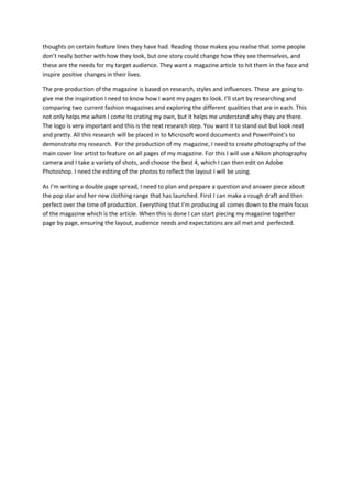 The document discusses the planning and preparation for a student's final major project, which is to create a fashion magazine. The magazine will focus on a pop star who has launched their own clothing line. It will include a front cover, contents page, and a double page interview article. The student discusses researching layouts of existing magazines, choosing fonts and images for the cover, targeting the magazine at teenage and young adult females, and creating photos and an interview for the double page article.