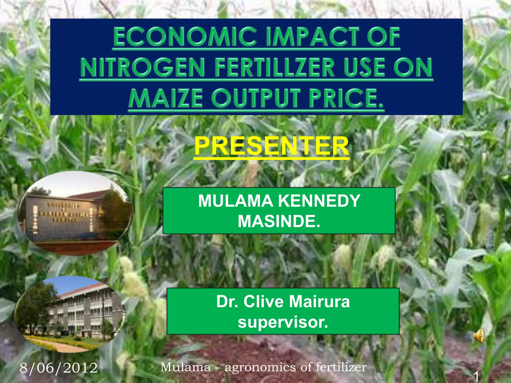 The document outlines a study being presented by Mulama Kennedy Masinde on the economic impact of nitrogen fertilizer use on maize output price. The study will examine the effects of applying nitrogen fertilizer at different times on the growth, yield components, and gross margin of maize. The results of the study aim to improve soil nutrient management and increase the marginal benefit-cost ratio for maize producers.