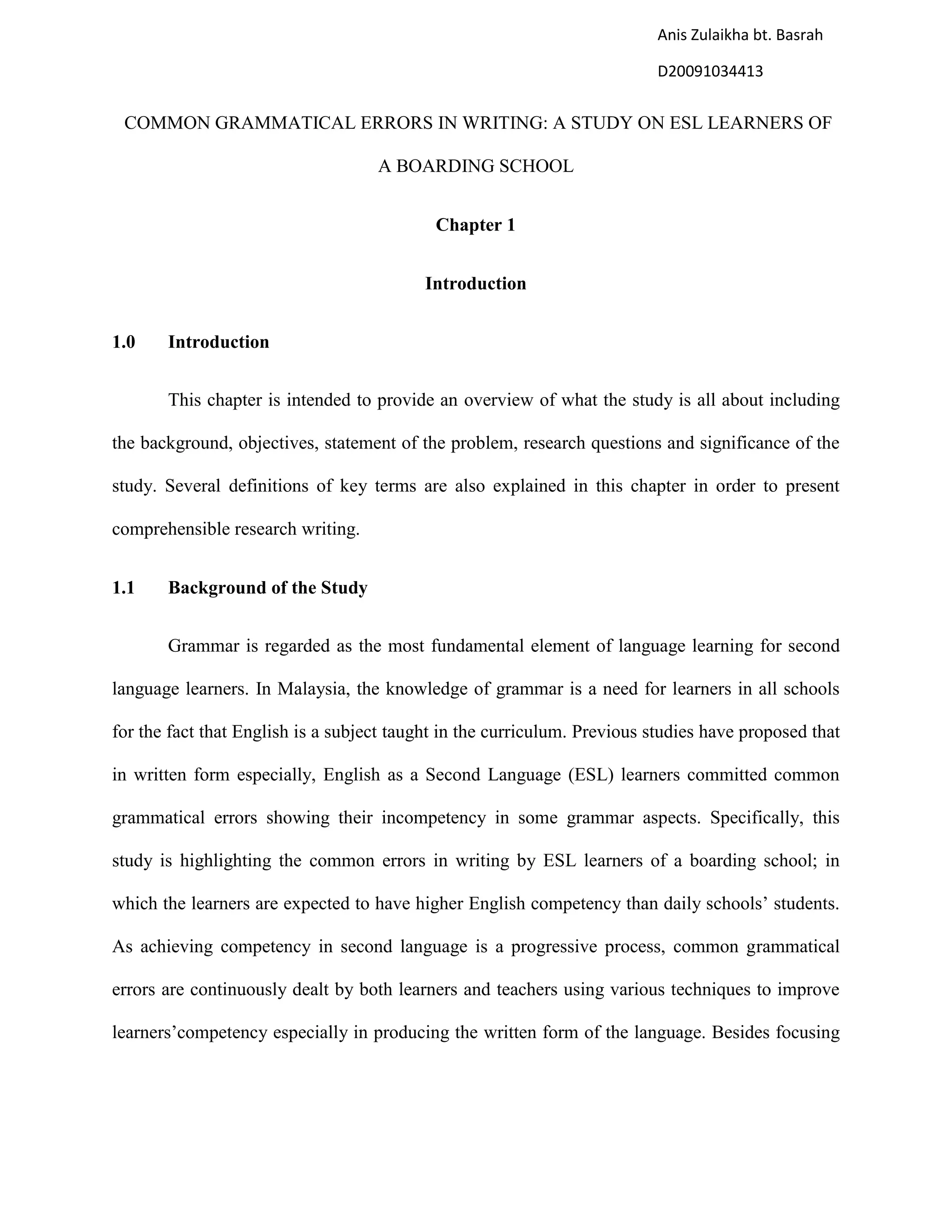 This document summarizes a study on common grammatical errors in writing by English as a Second Language (ESL) learners at a Malaysian boarding school. The study has several objectives: to identify the most common grammatical errors, determine why these errors are committed, and provide suggestions to minimize errors. Previous research has found errors with pronouns, verbs, nouns, prepositions and more. Common causes of errors include interference from the first language and lack of grammar knowledge. The document reviews literature on grammar instruction, distinguishing errors from mistakes, common errors found in other studies, and perspectives on feedback. It concludes by outlining the research methodology, which involves a case study analyzing students' writing samples to identify errors and their causes
